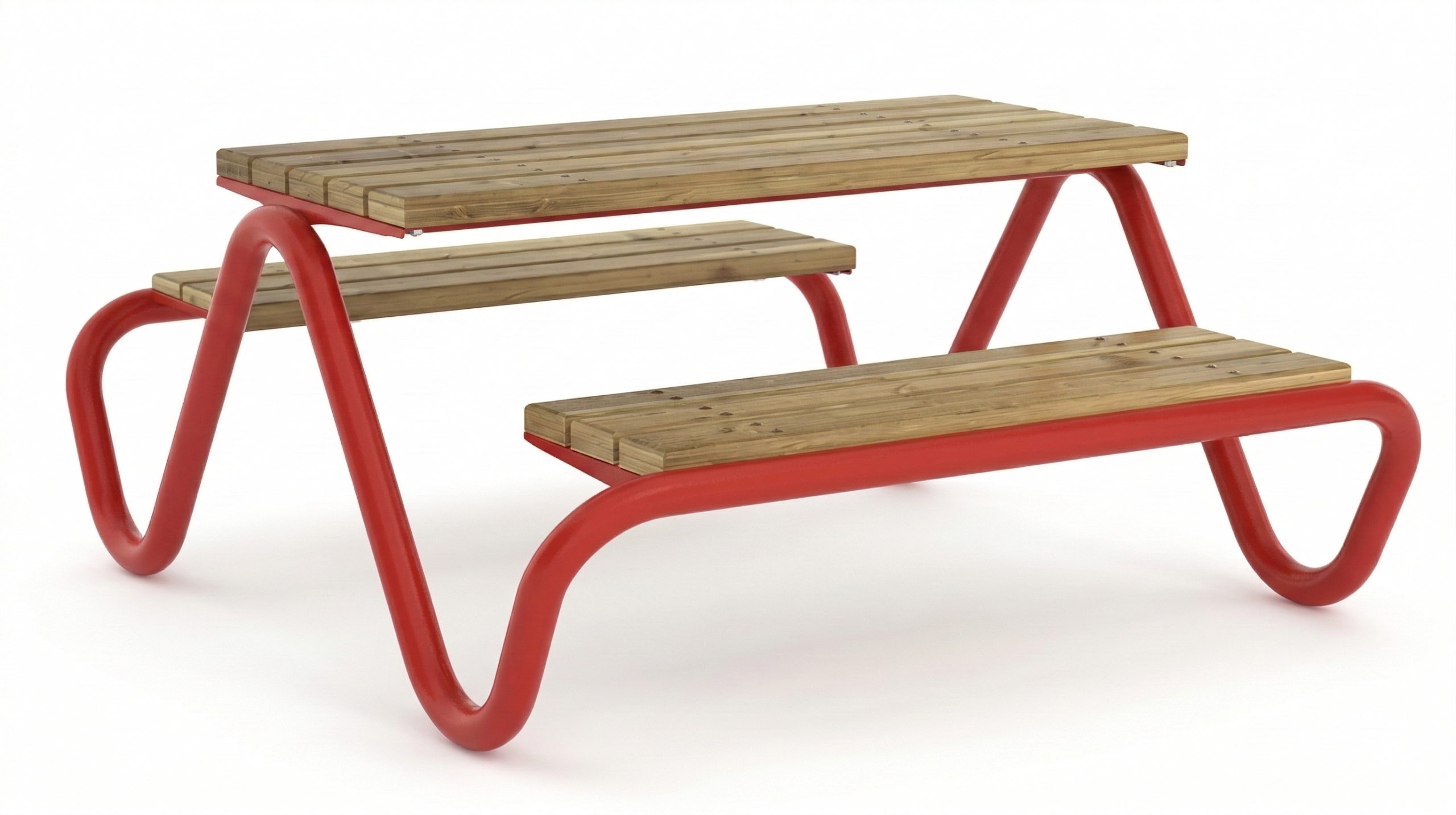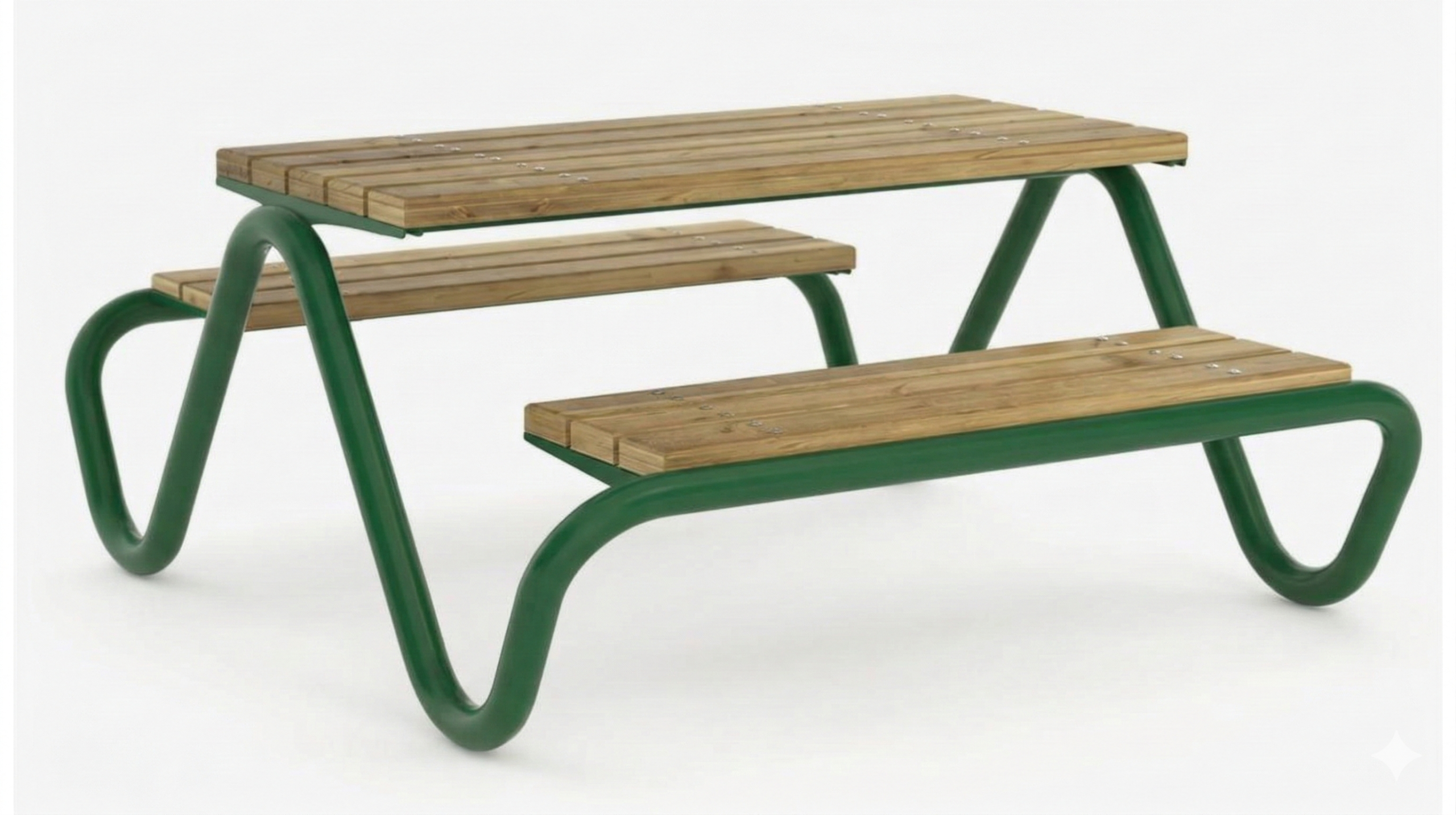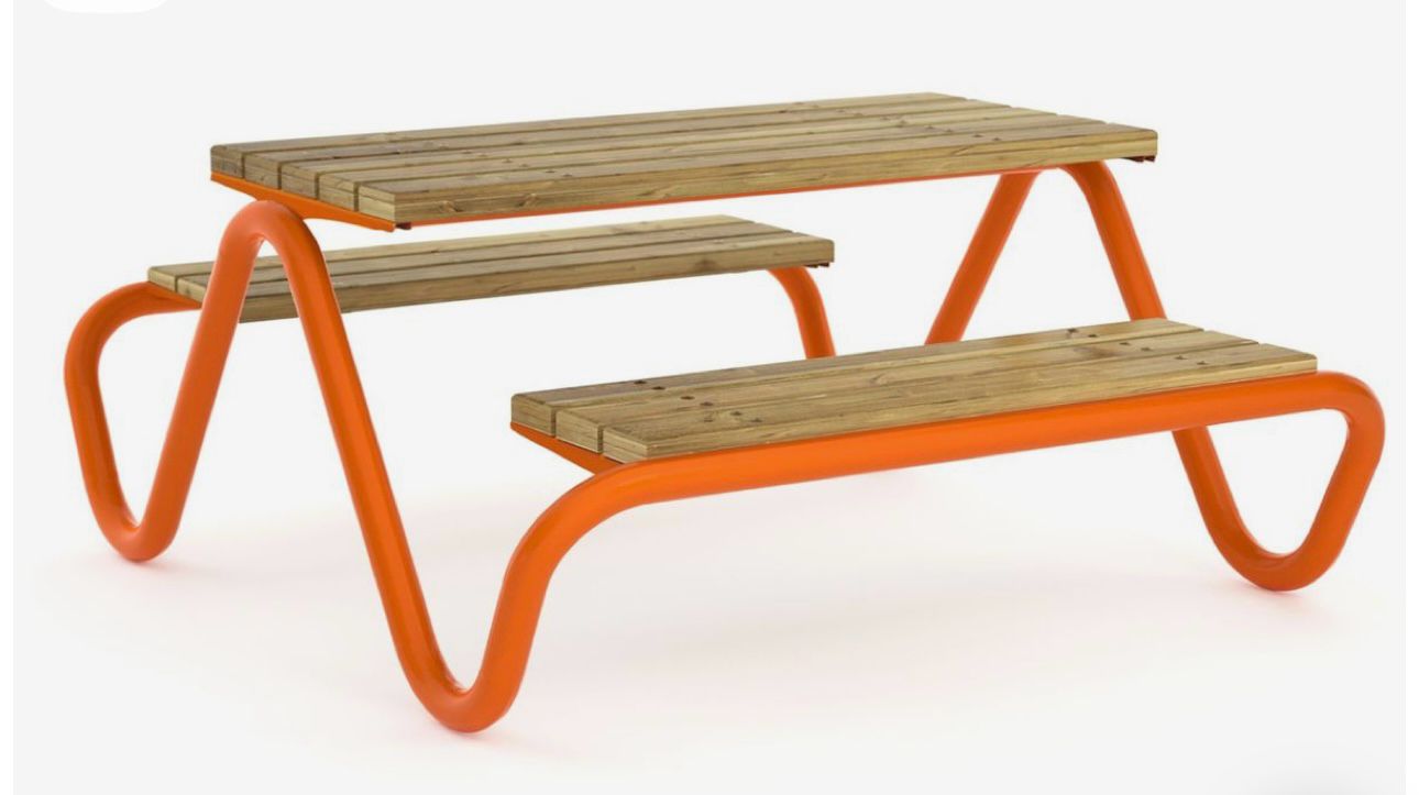 Blatul mesei si bancutele sunt realizate din lemn masiv, atent finisat, oferind un aspect natural si un confort placut in utilizare. Prinderea elementelor din lemn pe structura metalica este realizata in multiple puncte pe toata lungimea lamelelor astfel incat sarcinile sa fie distribuite uniform, contribuind la rezistenta ansamblului si la o buna comportare in exploatare.