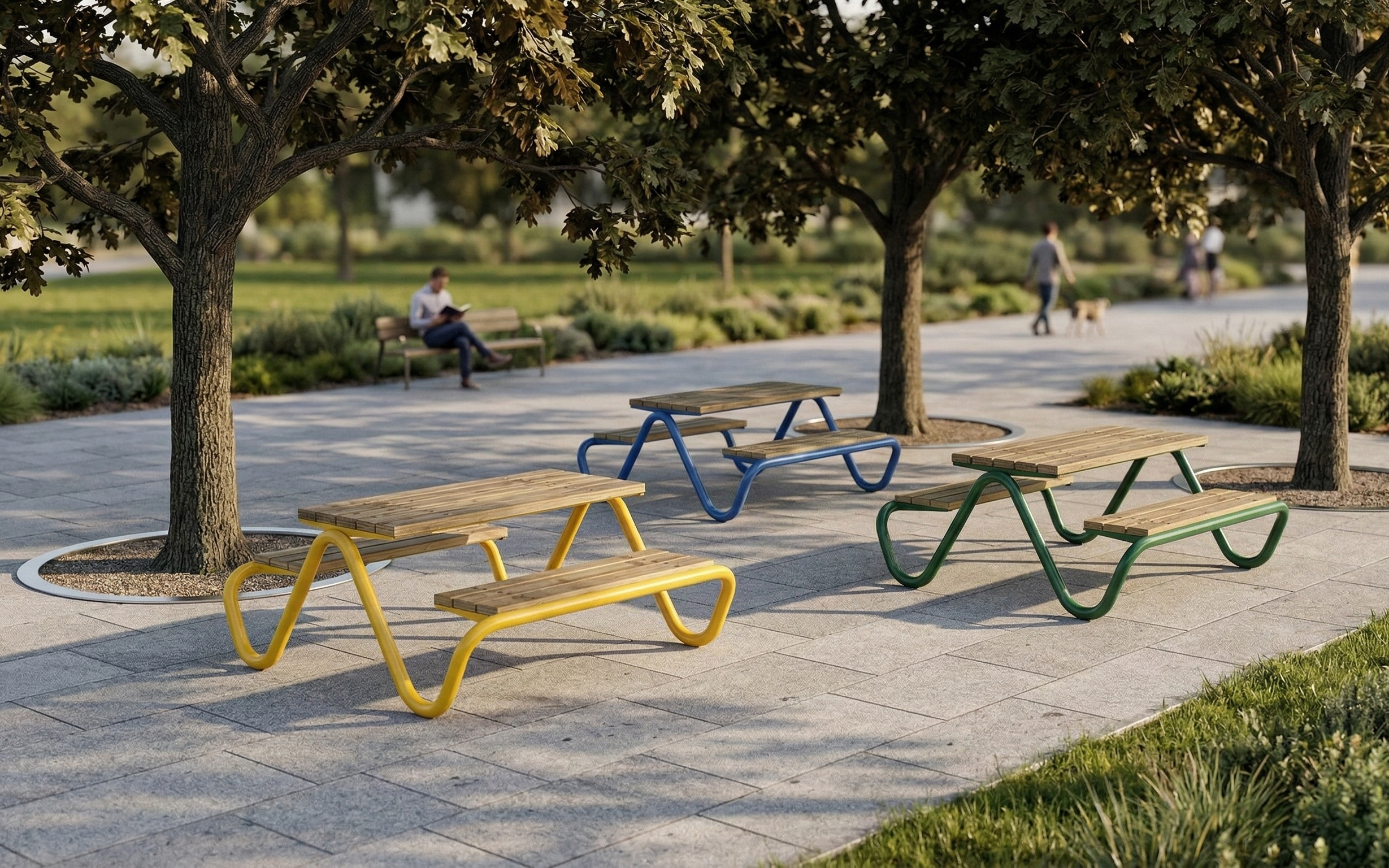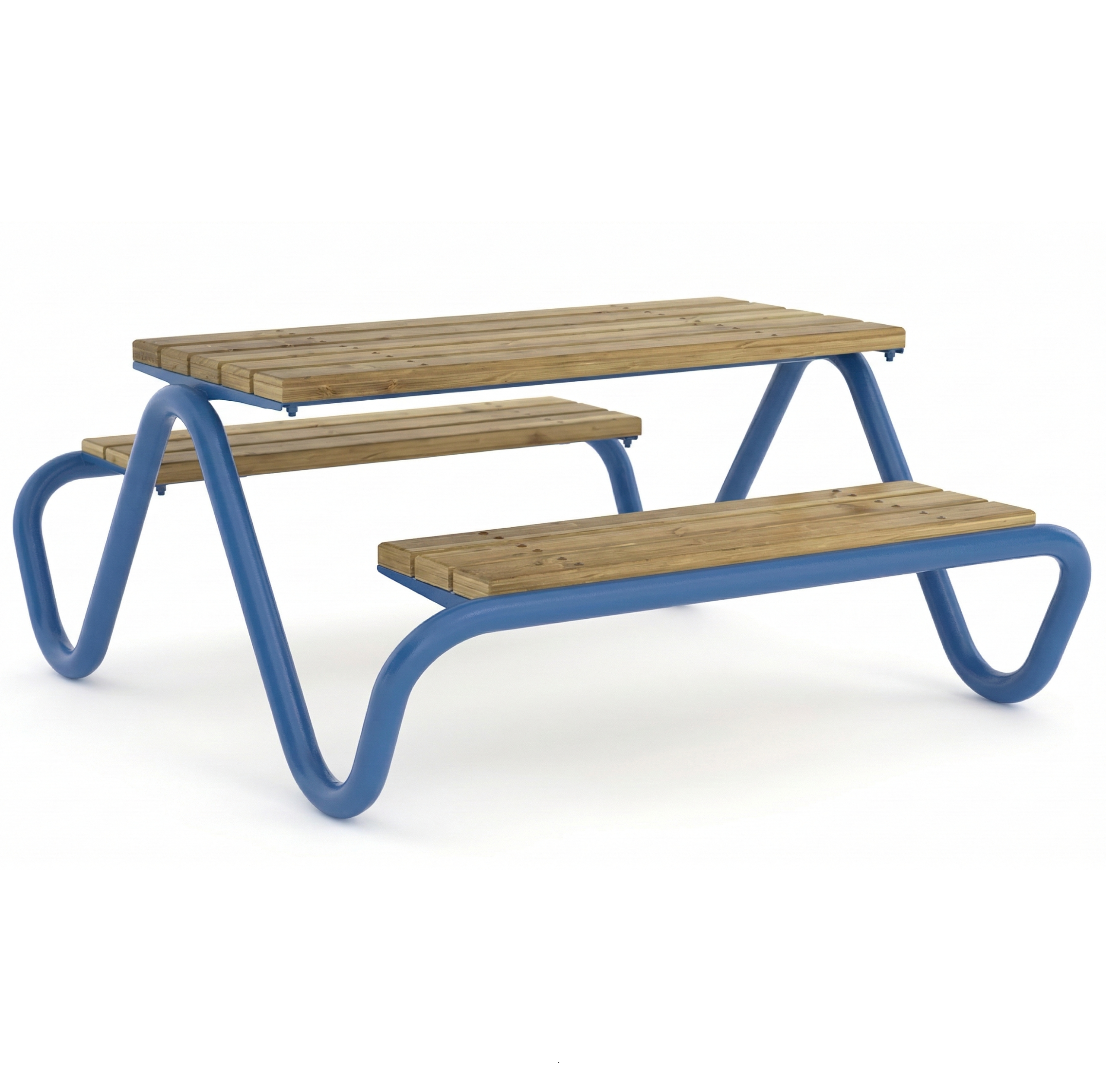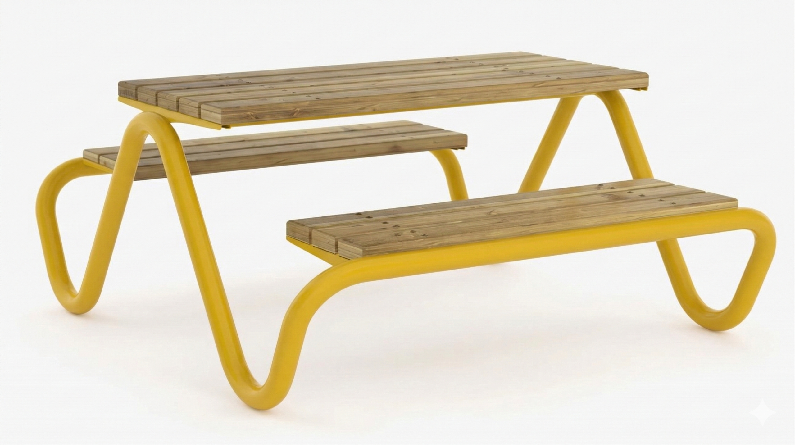 Blatul mesei si bancutele sunt realizate din lemn masiv, atent finisat, oferind un aspect natural si un confort placut in utilizare. Prinderea elementelor din lemn pe structura metalica este realizata in multiple puncte pe toata lungimea lamelelor astfel incat sarcinile sa fie distribuite uniform, contribuind la rezistenta ansamblului si la o buna comportare in exploatare.